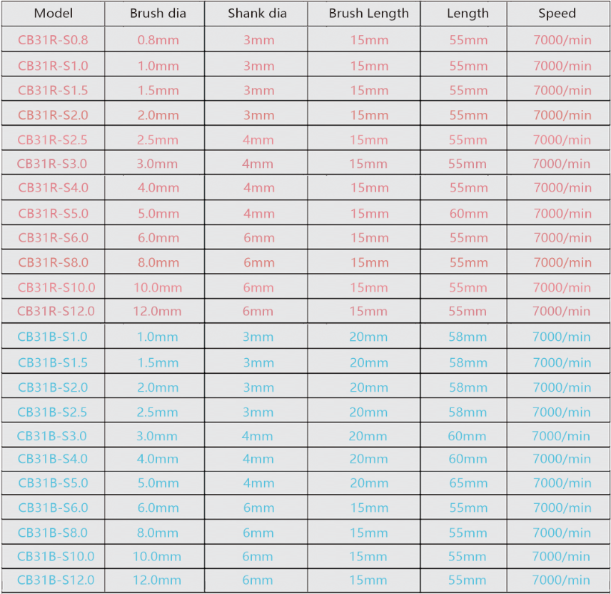 With more strong grinding power and nice cutting action, so blue CB31B-S series brushes usually for magnesium alloy,stainless steel, iron, die casting...harder metal type, after drilling or end milling