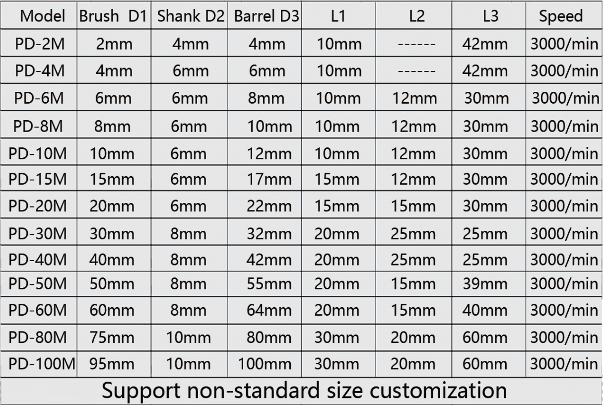 A---Sizes of VEYER plane metal deburring polish brush from diameter 2mm, 4mm, 6mm,8mm,20mm...40mm...