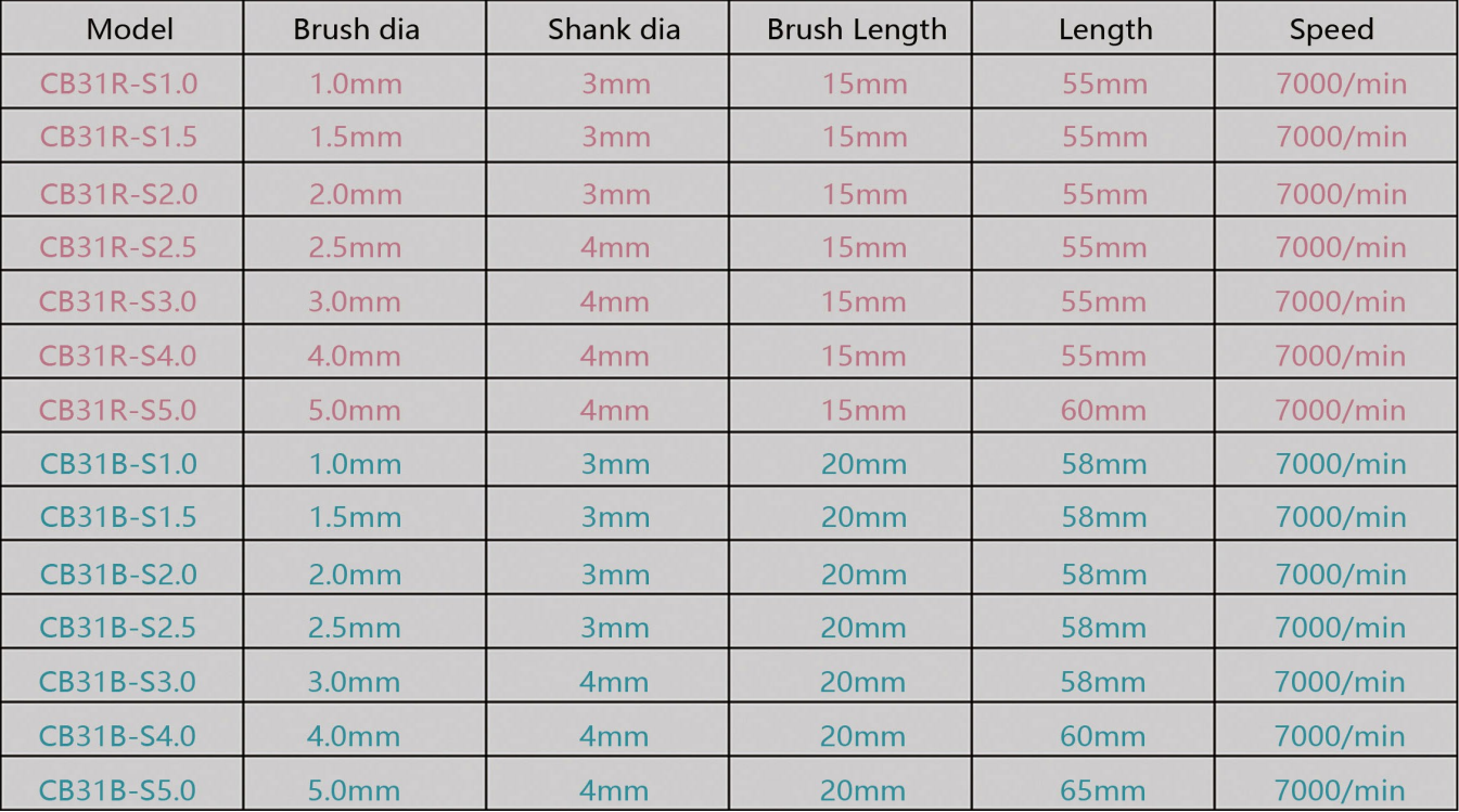 With more strong grinding power and nice cutting action, so blue CB31B-S series brushes usually for magnesium alloy,stainless steel, iron, die casting...harder metal type, after drilling or end milling
